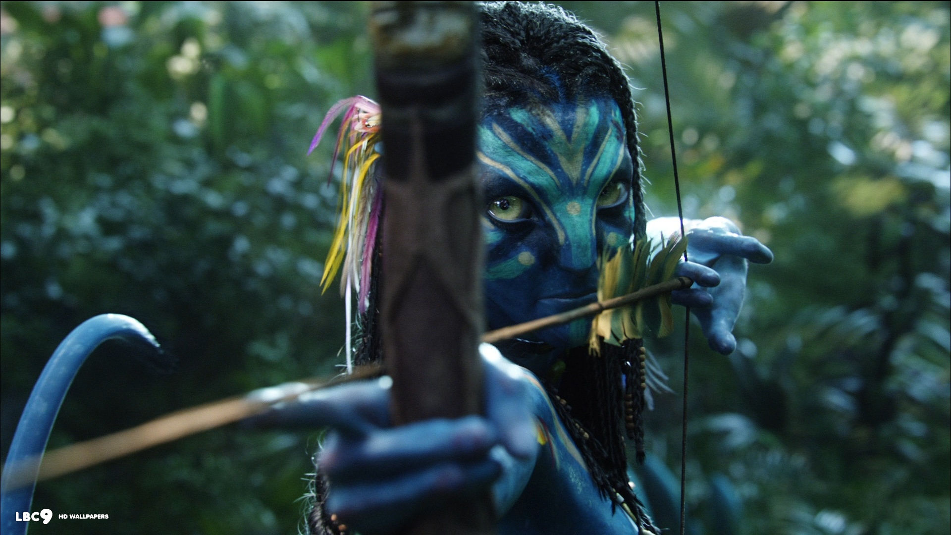 Description: A woman with blue makeup holding a bow and arrow in her hands and painted body paint on her face.