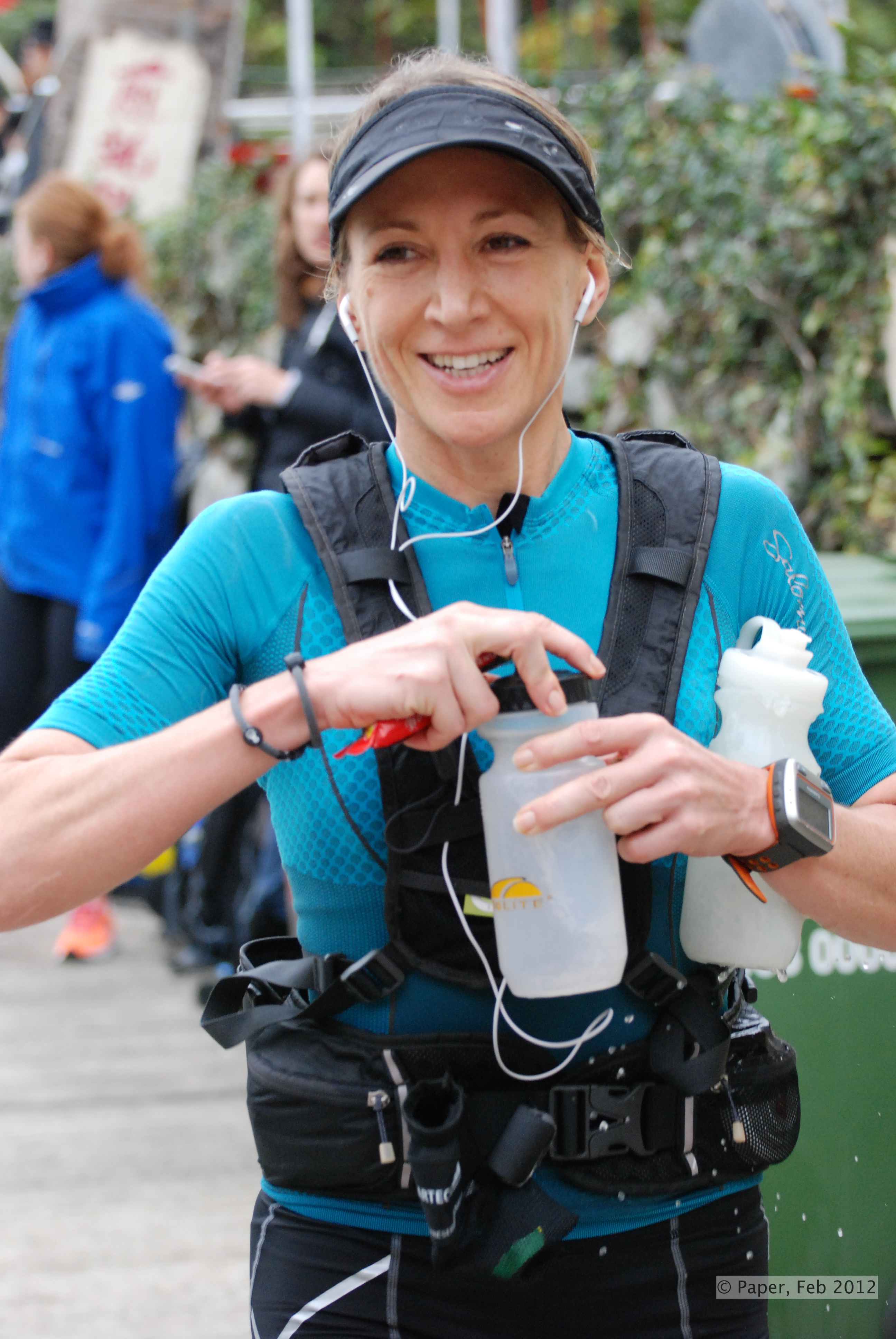 Description: A woman in a blue shirt and black hat is holding a bottle and a pair of headphones and a backpack.