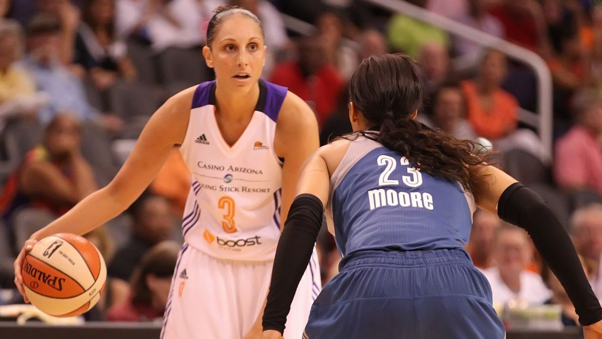 Description: A woman in a blue uniform is playing basketball with another woman in a blue uniform and a crowd of people.
