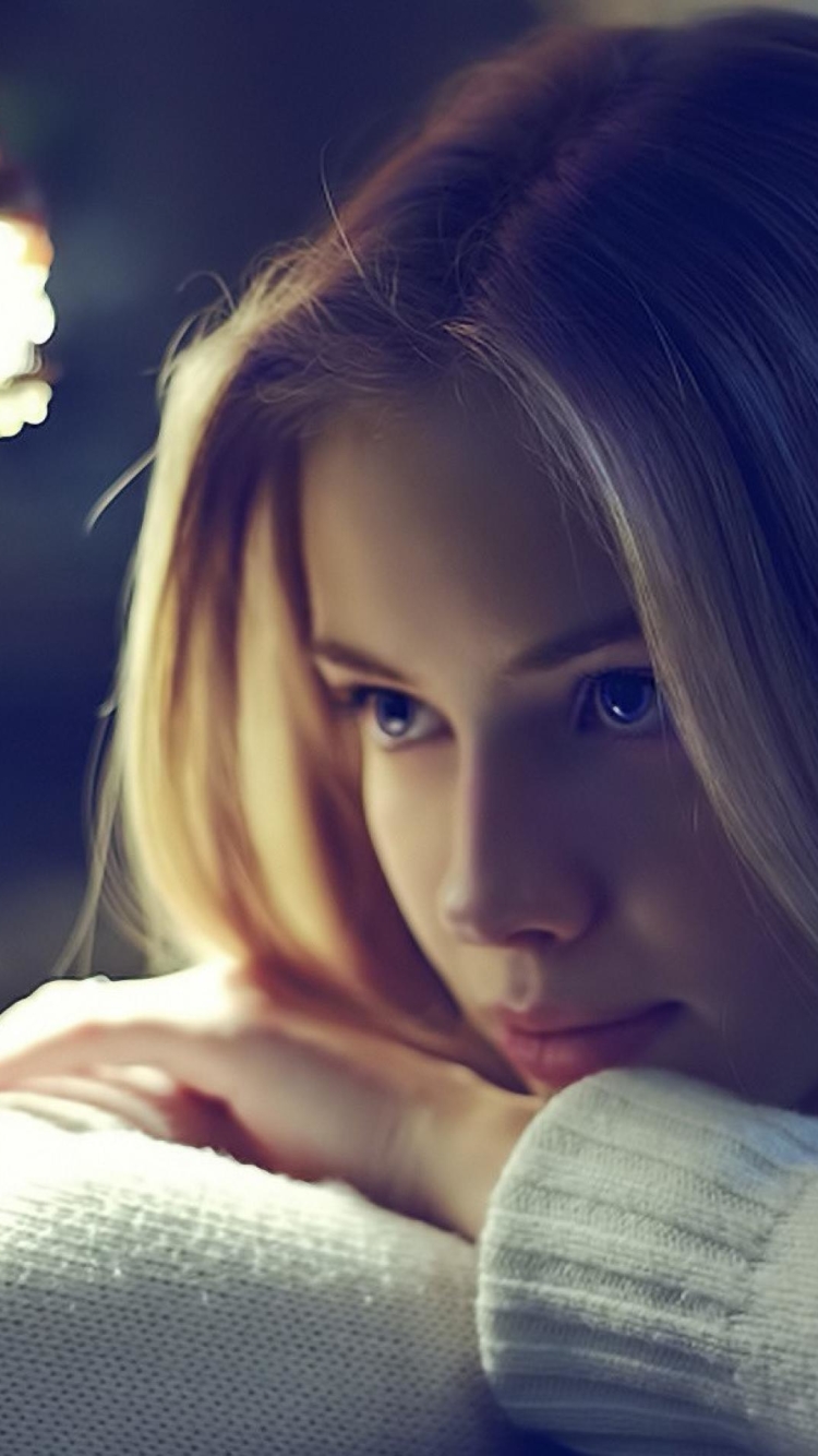Description: A woman with long hair and blue eyes posing for a picture with her hand on her shoulder and her hand on her shoulder.