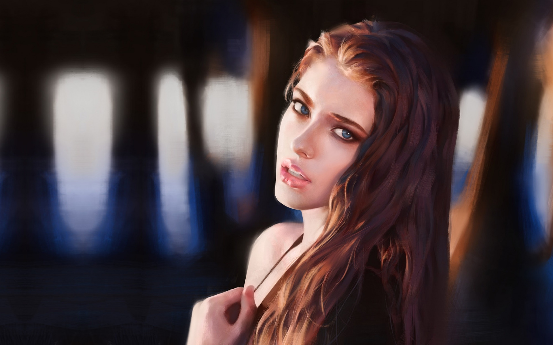 Description: A painting of a woman with long hair and blue eyes looking at the camera with a serious look on her face.