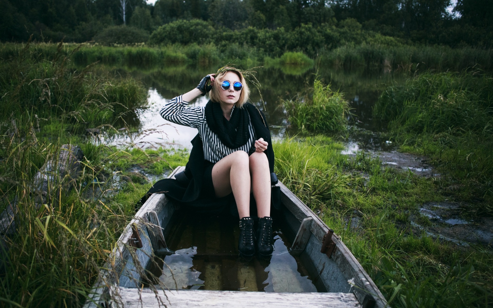 Description: A woman sitting in a boat in a swampy area with a lake in the background and trees in the background.