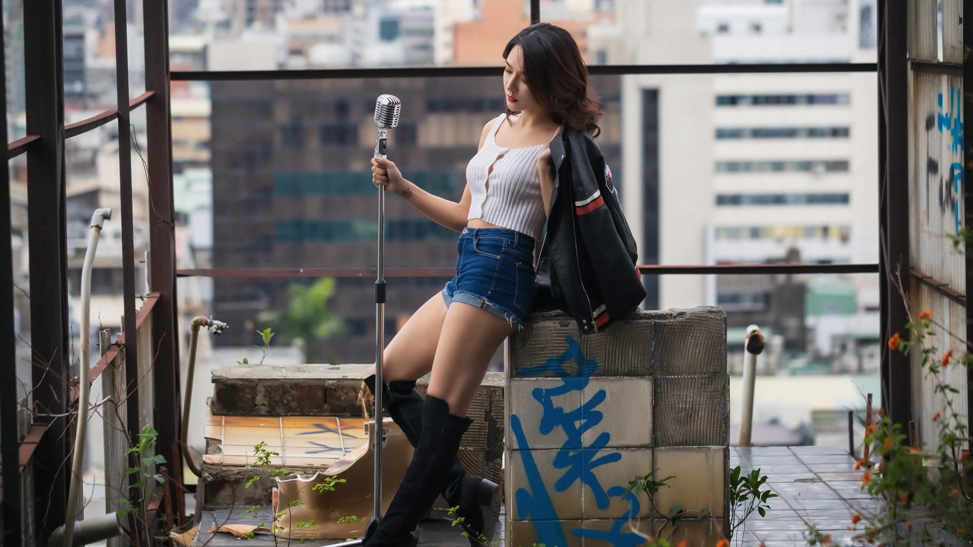 Description: A woman in short shorts and boots holding a microphone and standing on a ledge with graffiti on it and a city in the background.