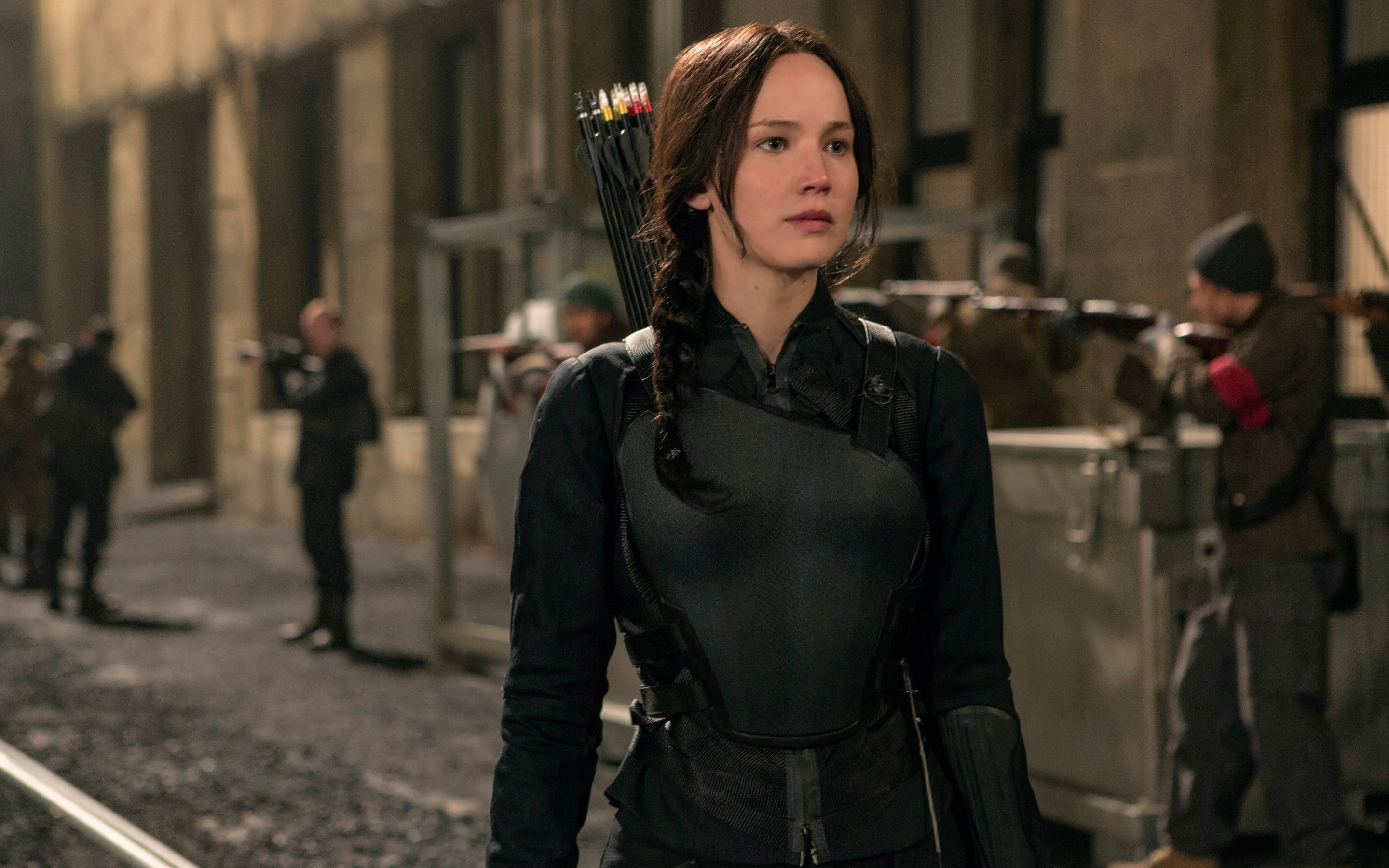 Description: A woman in a black outfit holding a bow and arrow in her hand while standing on a street corner.