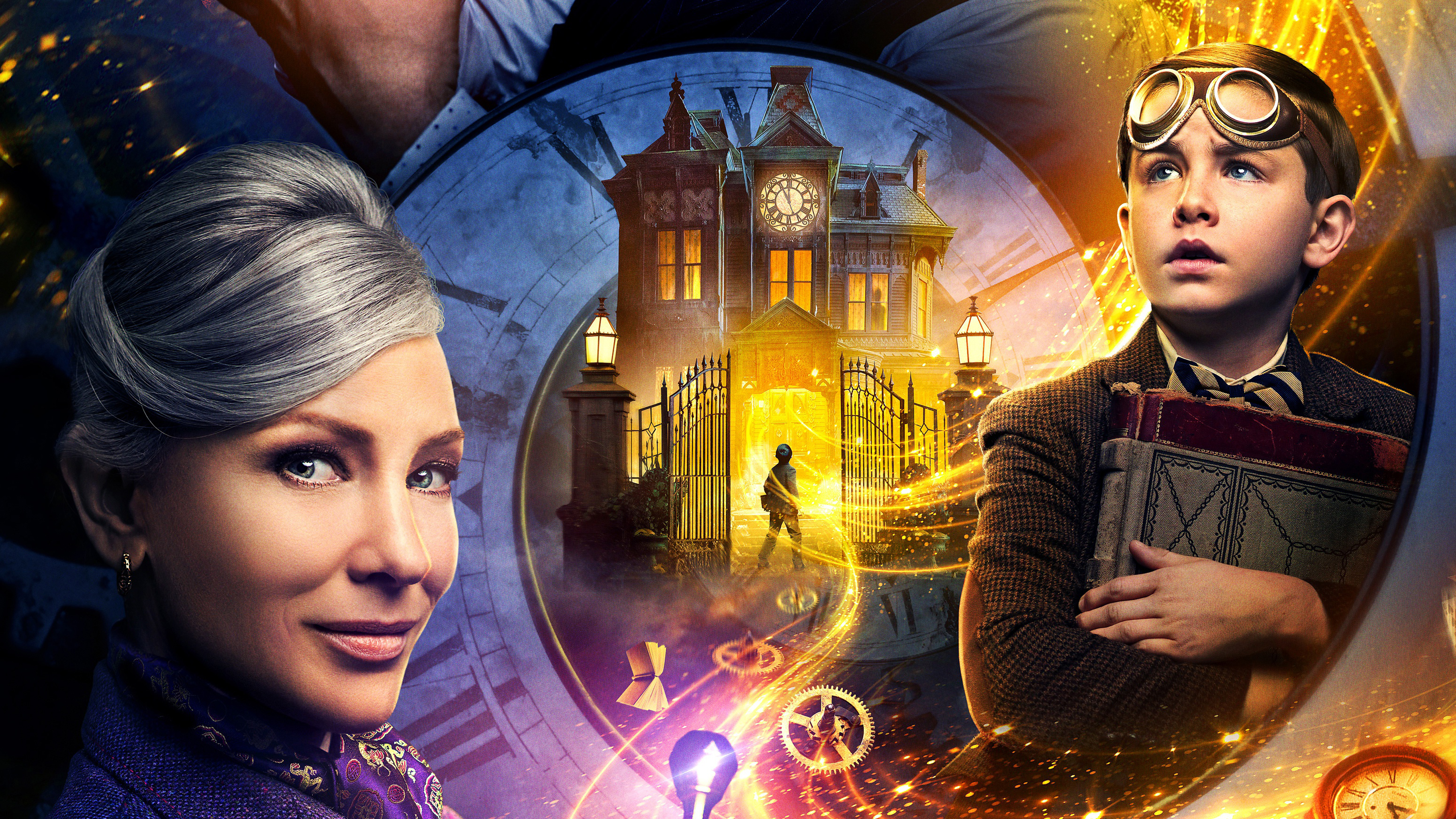 Description: A woman and a boy are looking at a clock with a face on it and a clock in the background.