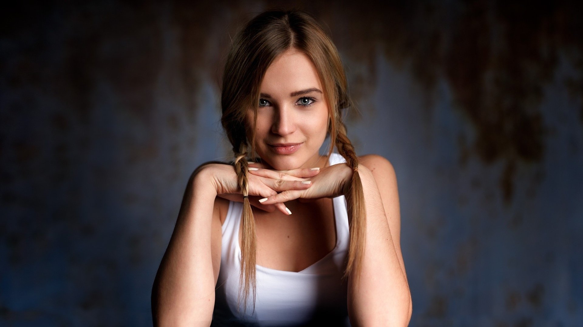 Description: A woman with long hair posing for a picture with her hands on her chest and her arms crossed.