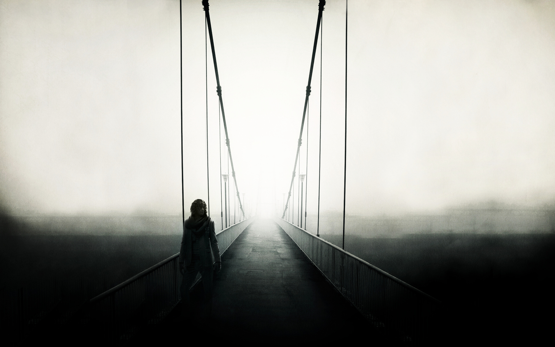 Description: A woman walking across a bridge in the foggy day with a light at the end of the bridge.