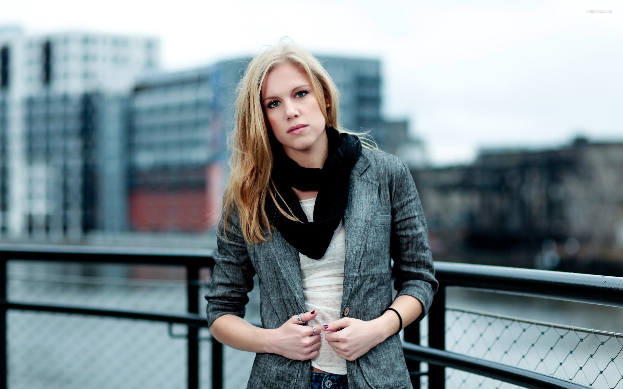 Description: A woman standing on a bridge with her hands in her pockets and a scarf around her neck.