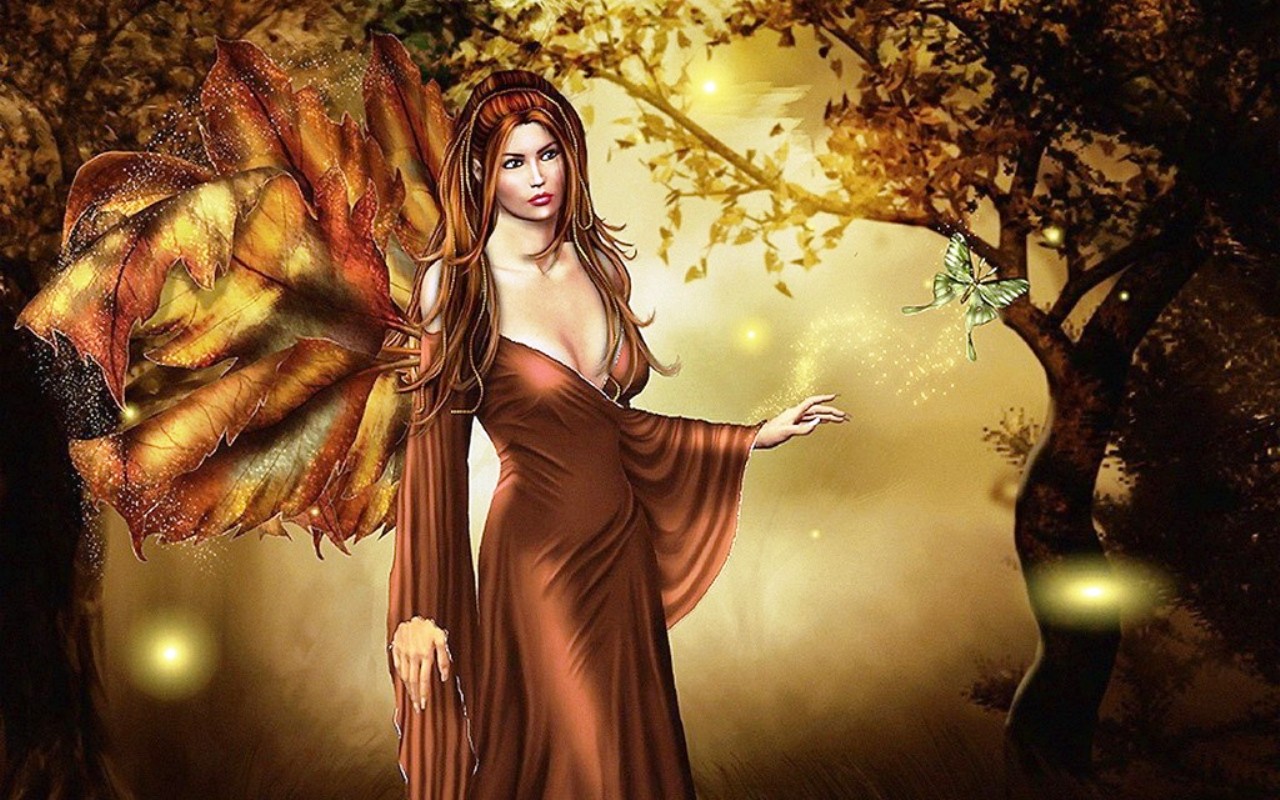 Description: A woman in a brown dress holding a butterfly in her hand and a tree in the background with fireflies.