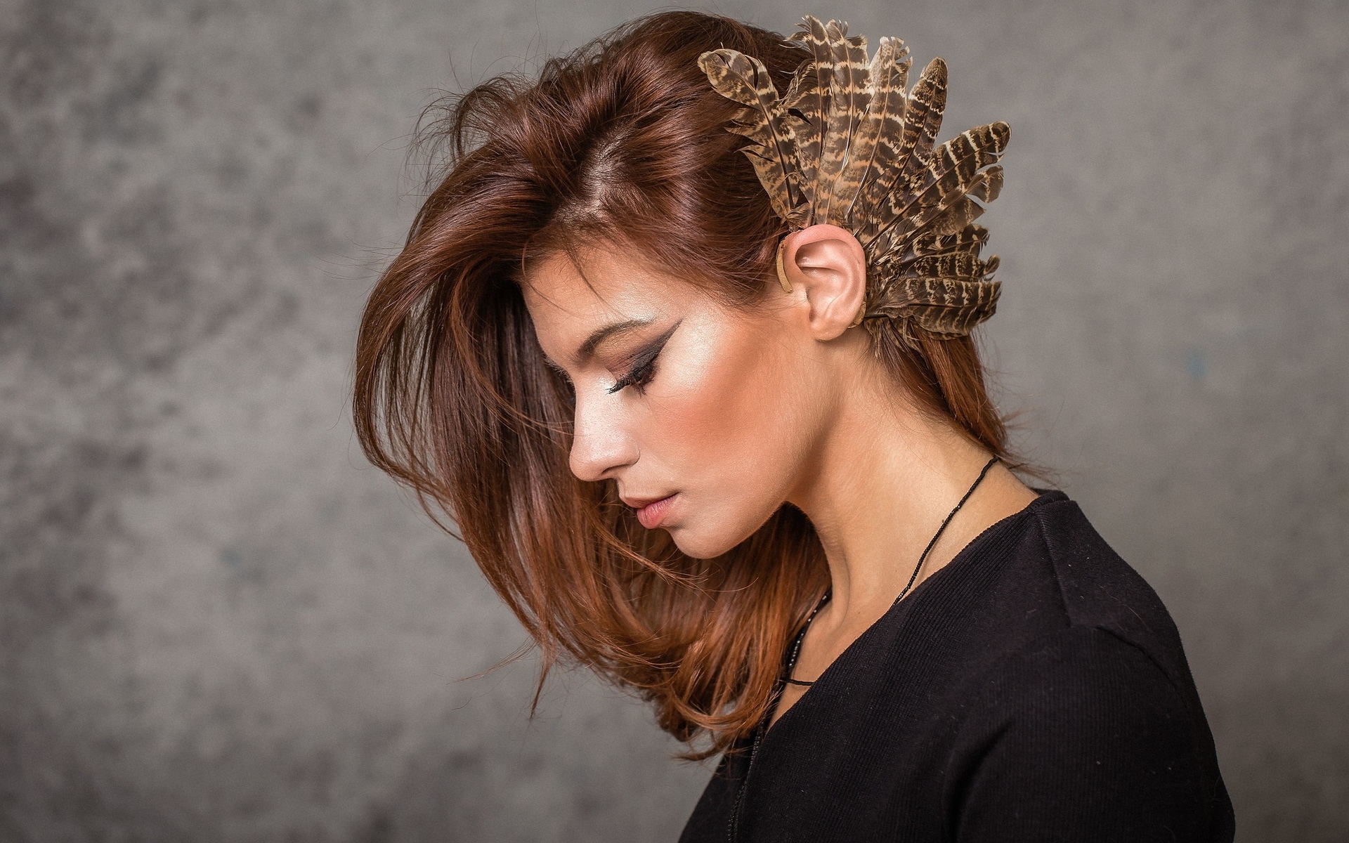 Description: A woman with a hair comb in her hair looking down at her face and looking down at her left side.