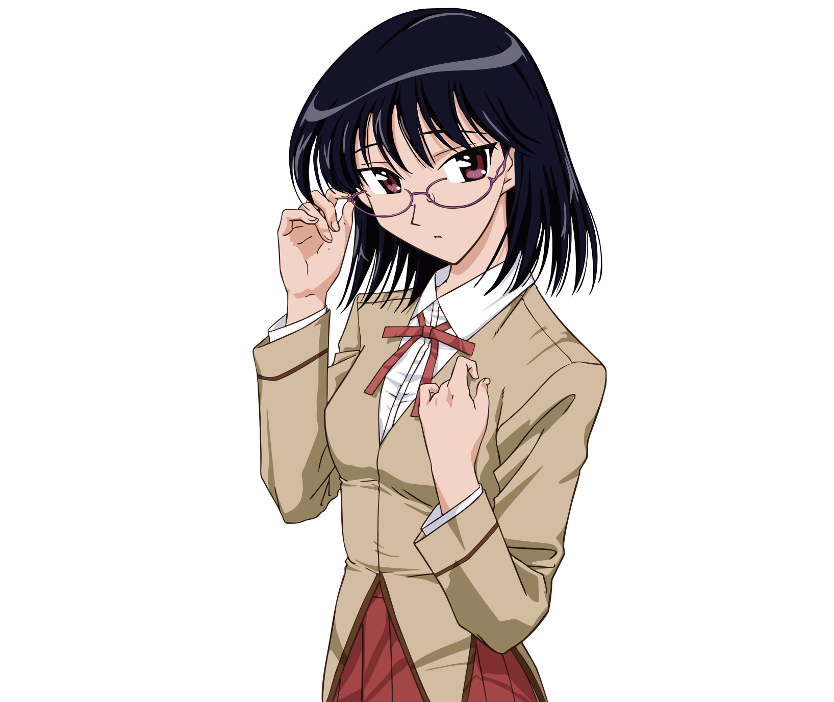 Description: A woman in a brown jacket and red skirt holding a cigarette in her hand and looking at the camera.