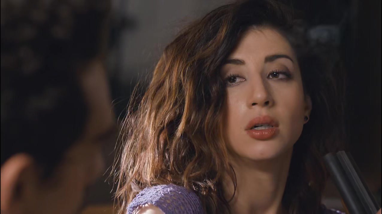 Description: A woman with a brush in her hand and a man in the background looking at her in the mirror.