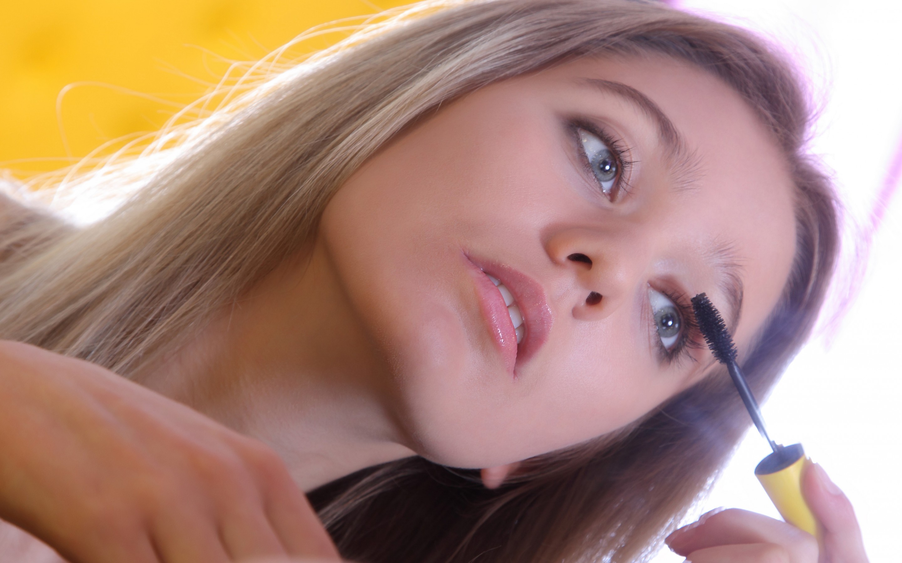 Description: A woman with a brush in her mouth and a yellow object in her hand.