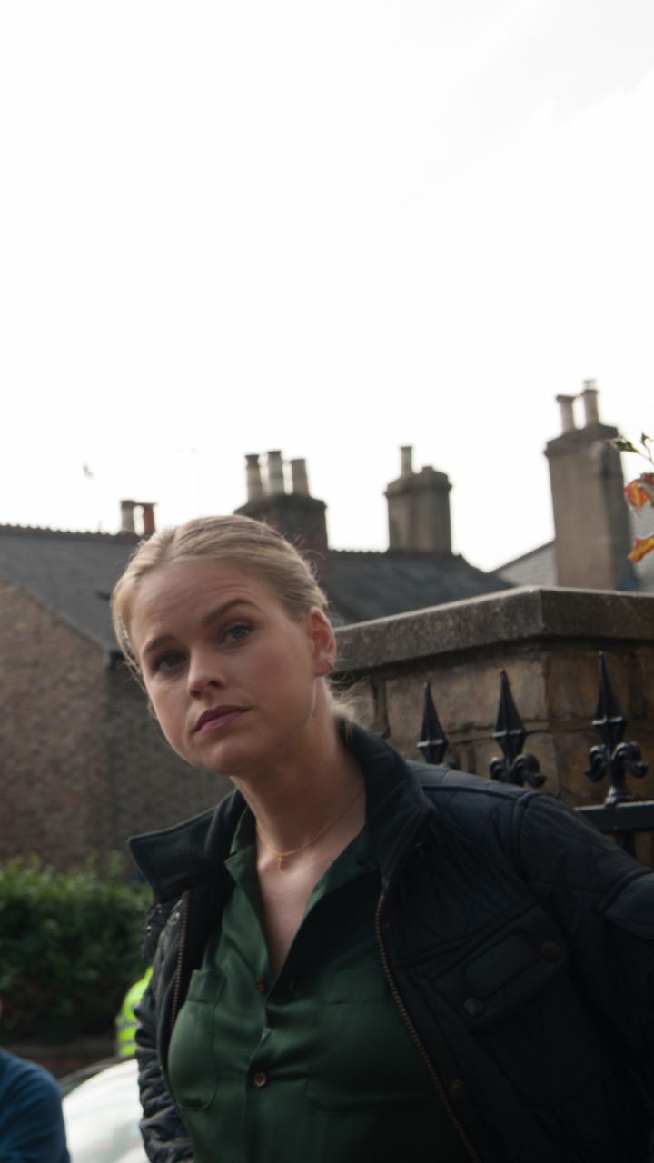 Description: A woman standing in front of a building with a clock on it's face and a man standing next to her.