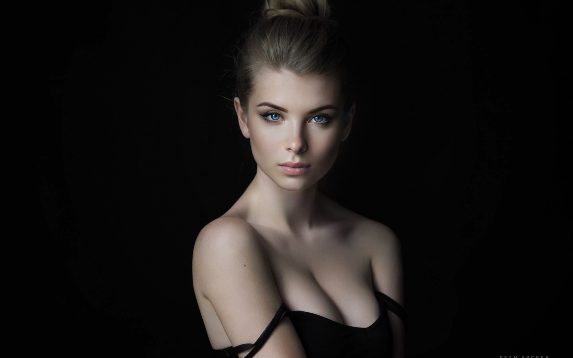 Description: A woman with a bun in her hair and blue eyes posing for a picture in the dark with her hands on her hips.