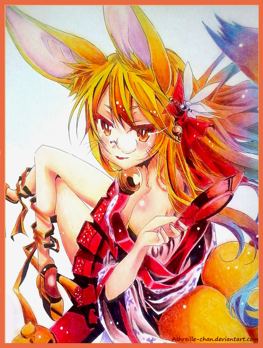Description: A drawing of a woman with a bunny ears and tail sitting on a pile of fruit with a red frame.