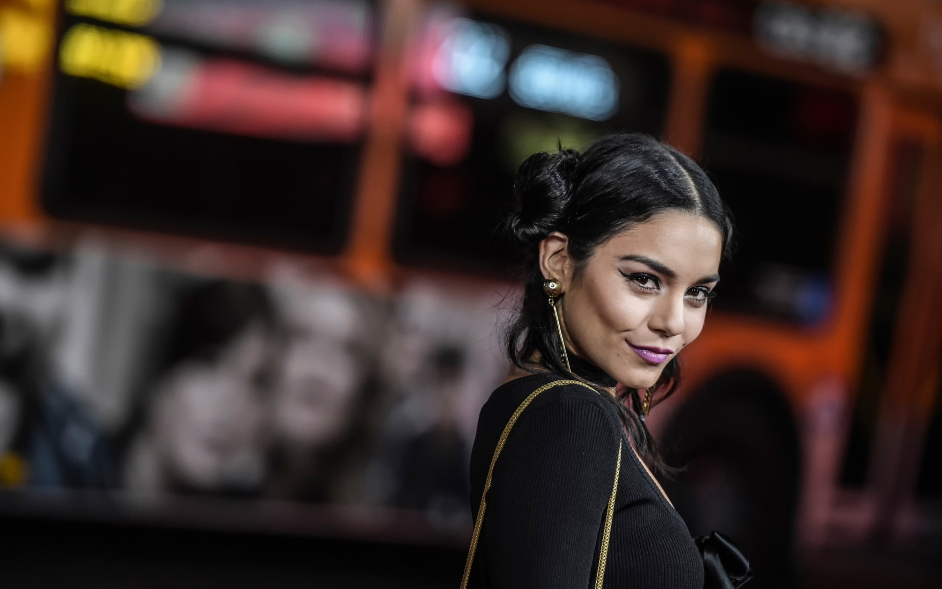 Description: A woman standing in front of a bus at night time with a smile on her face and a black dress.