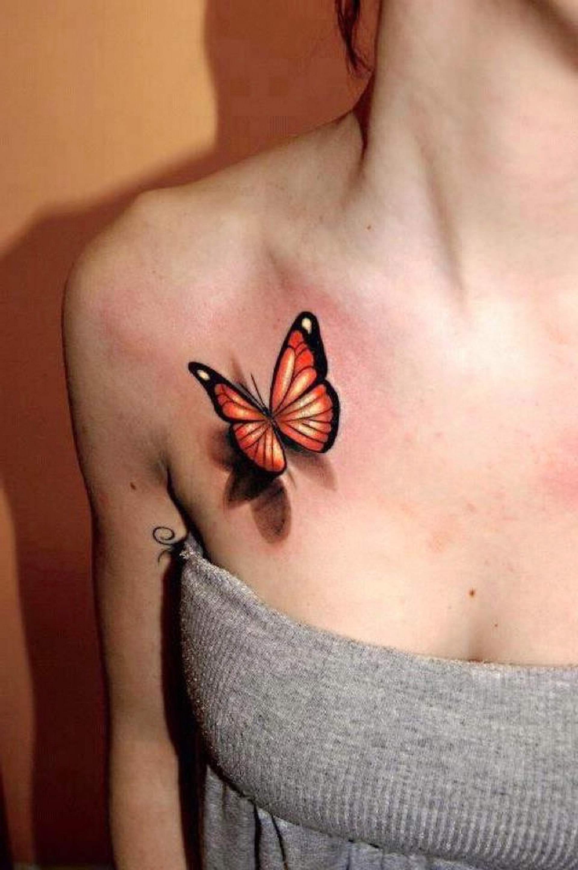Description: A woman with a butterfly tattoo on her chest and chest.