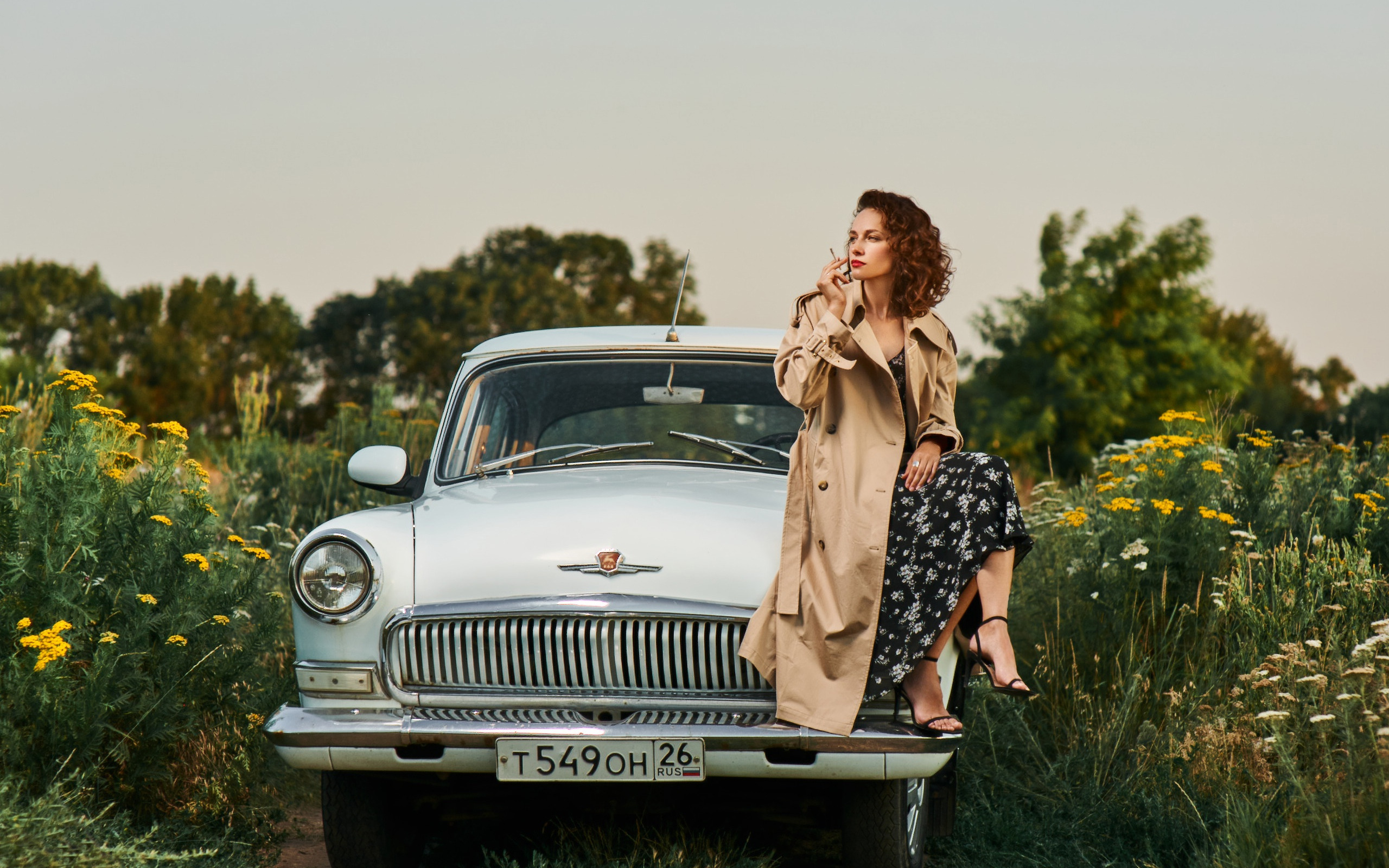 Description: A woman standing on the hood of a car in a field of flowers and grass with a man leaning on the hood of a car.