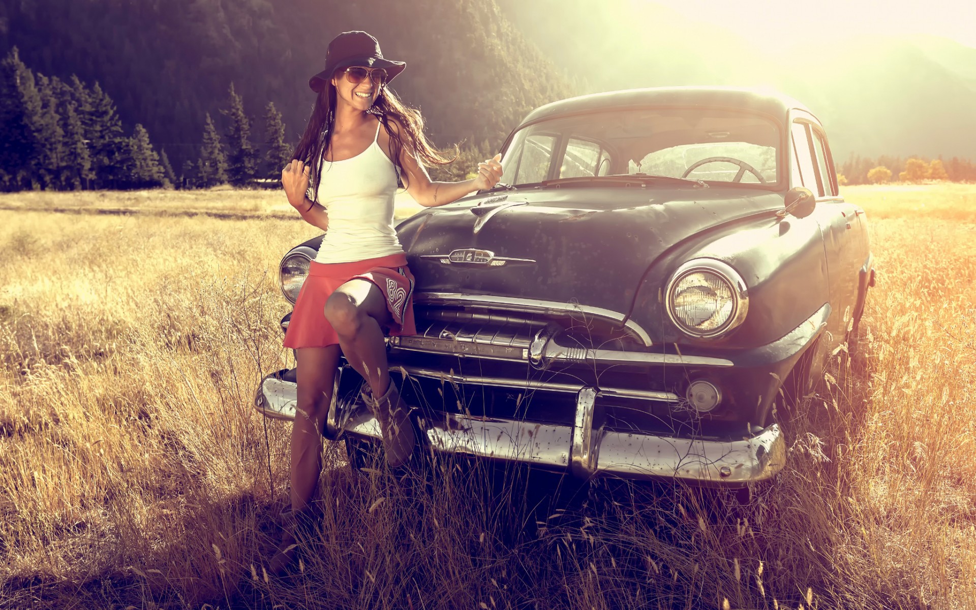 Description: A woman sitting on the hood of a car in a field of grass with a hat on her head.