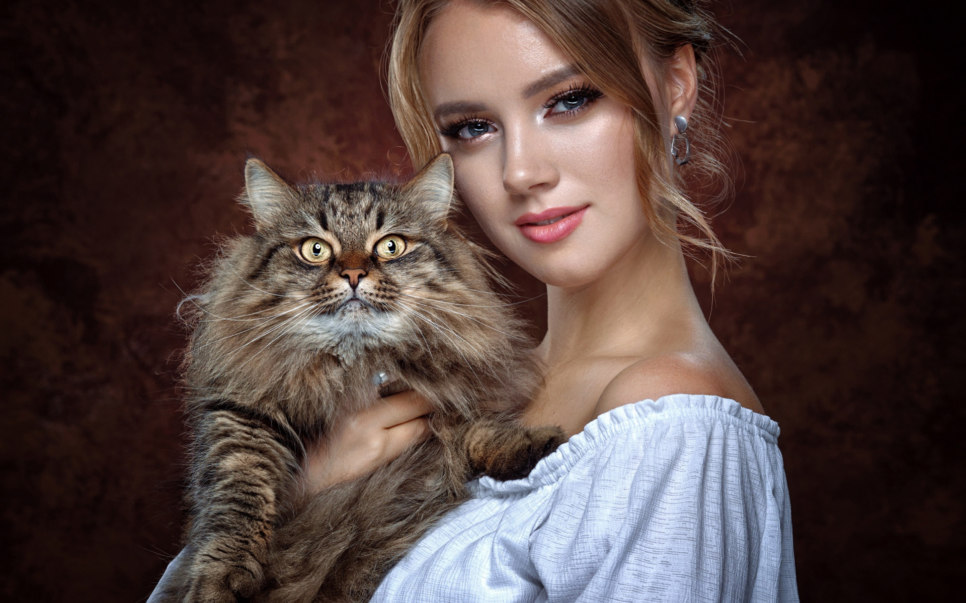 Description: A woman holding a cat in her arms and posing for a picture with a brown background and a brown wall.