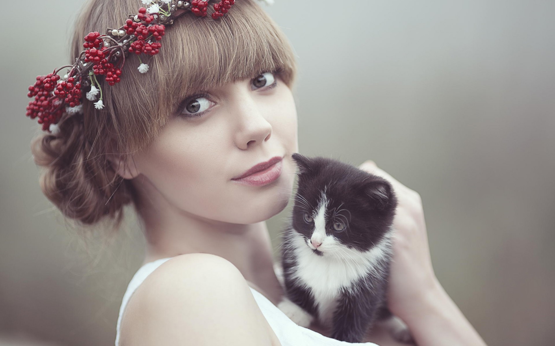 Description: A woman holding a black and white cat with a flower in her hair and a flower in her hair.