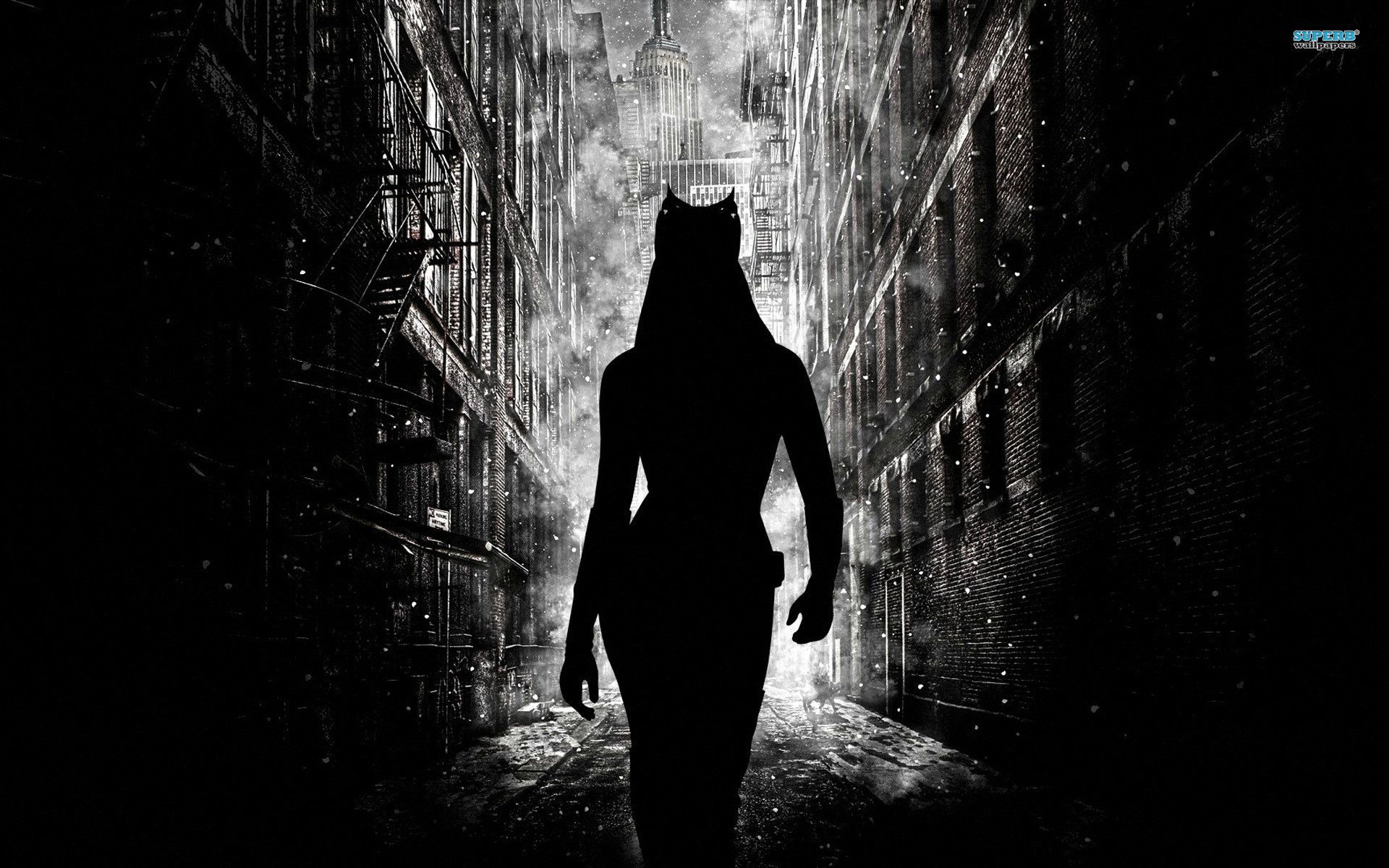 Description: A woman in a dark alley with a cat mask on walking towards a building with a clock tower in the background.
