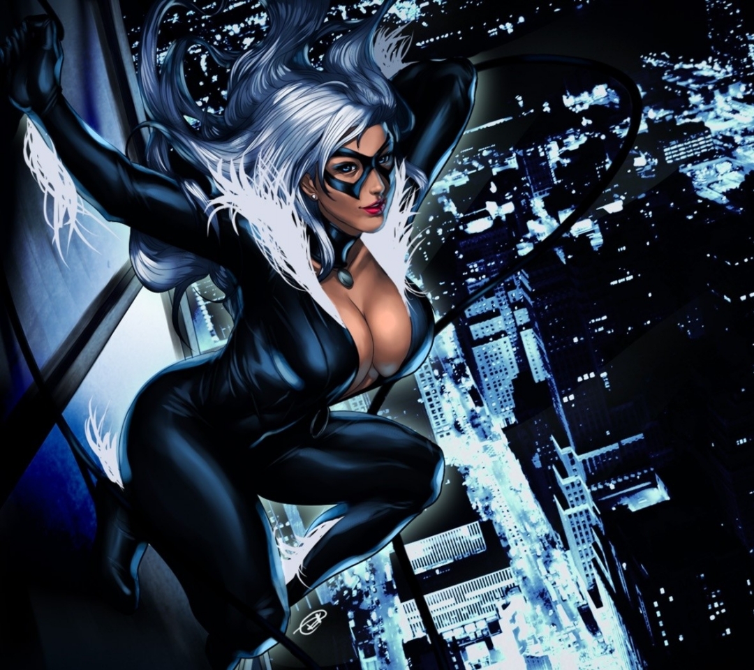 Description: A woman in a cat suit and mask is posing on a ledge in a city at night with a cityscape in the background.