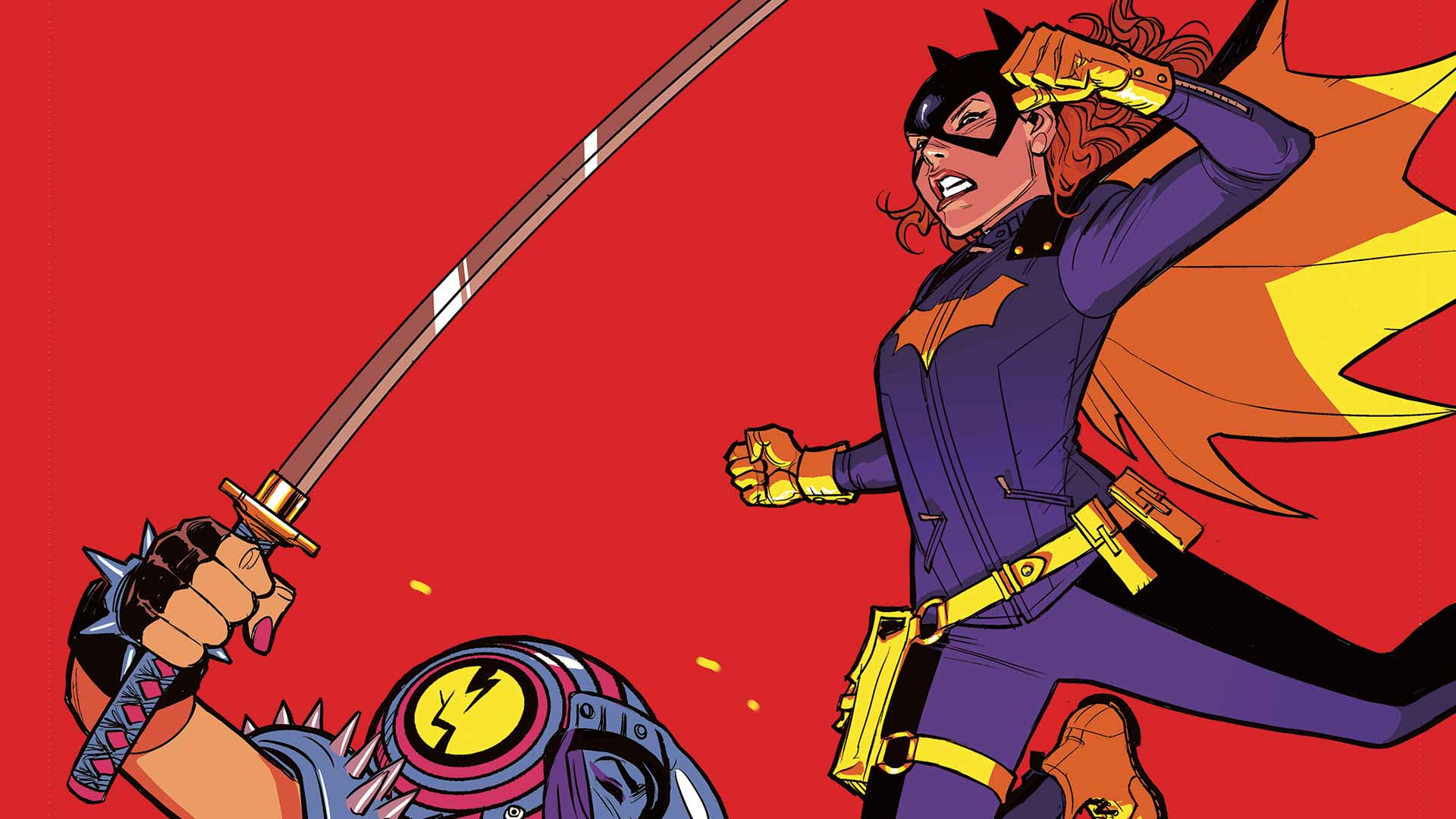 Description: A woman in a catwoman costume holding a sword and a catwoman figure behind her back with a red background.
