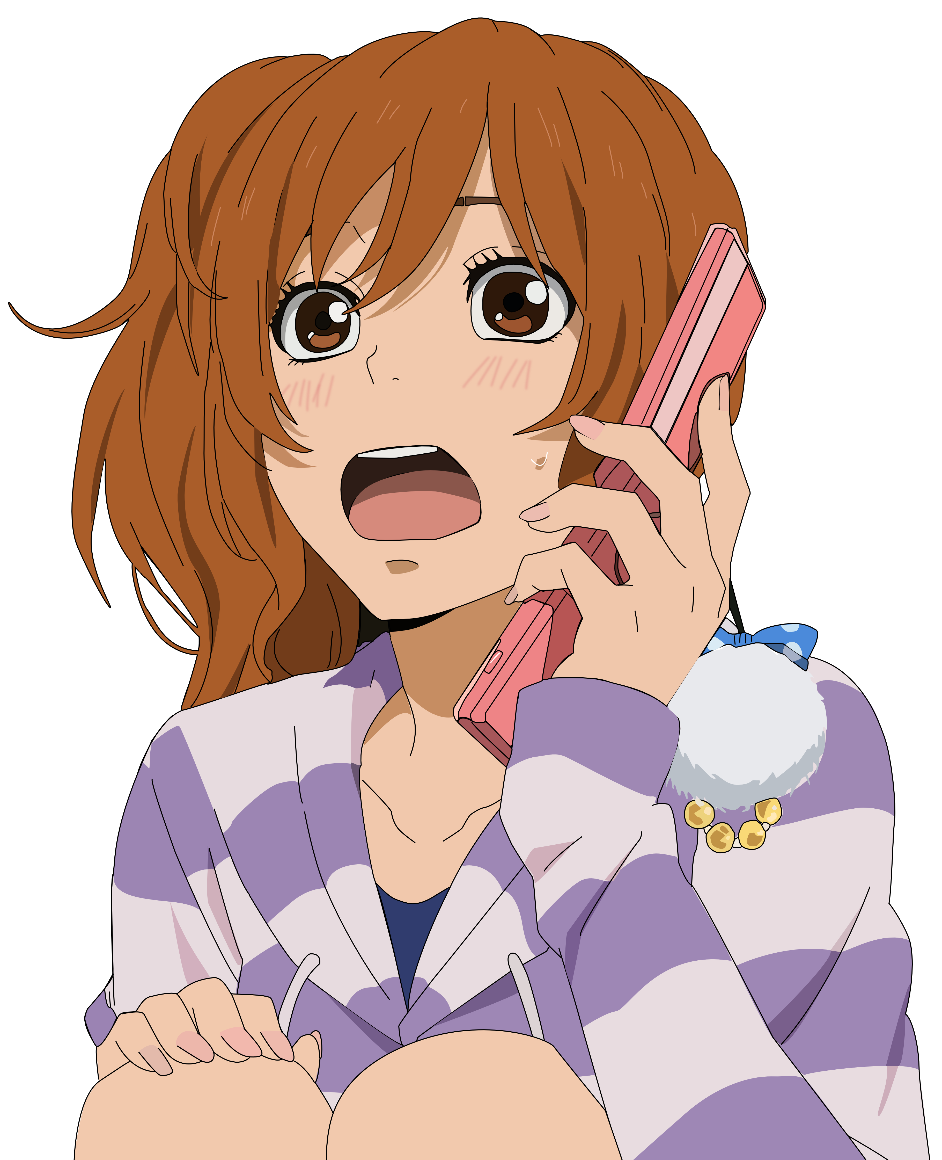 Description: A woman holding a cell phone to her ear and making a face with her mouth open while holding a cupcake.