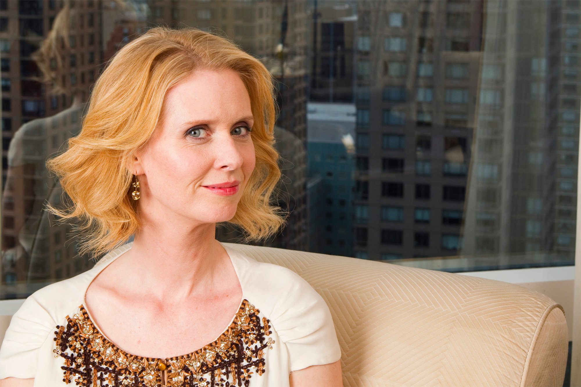 Description: A woman sitting in a chair looking at the camera with a city view behind her and a window in the background.