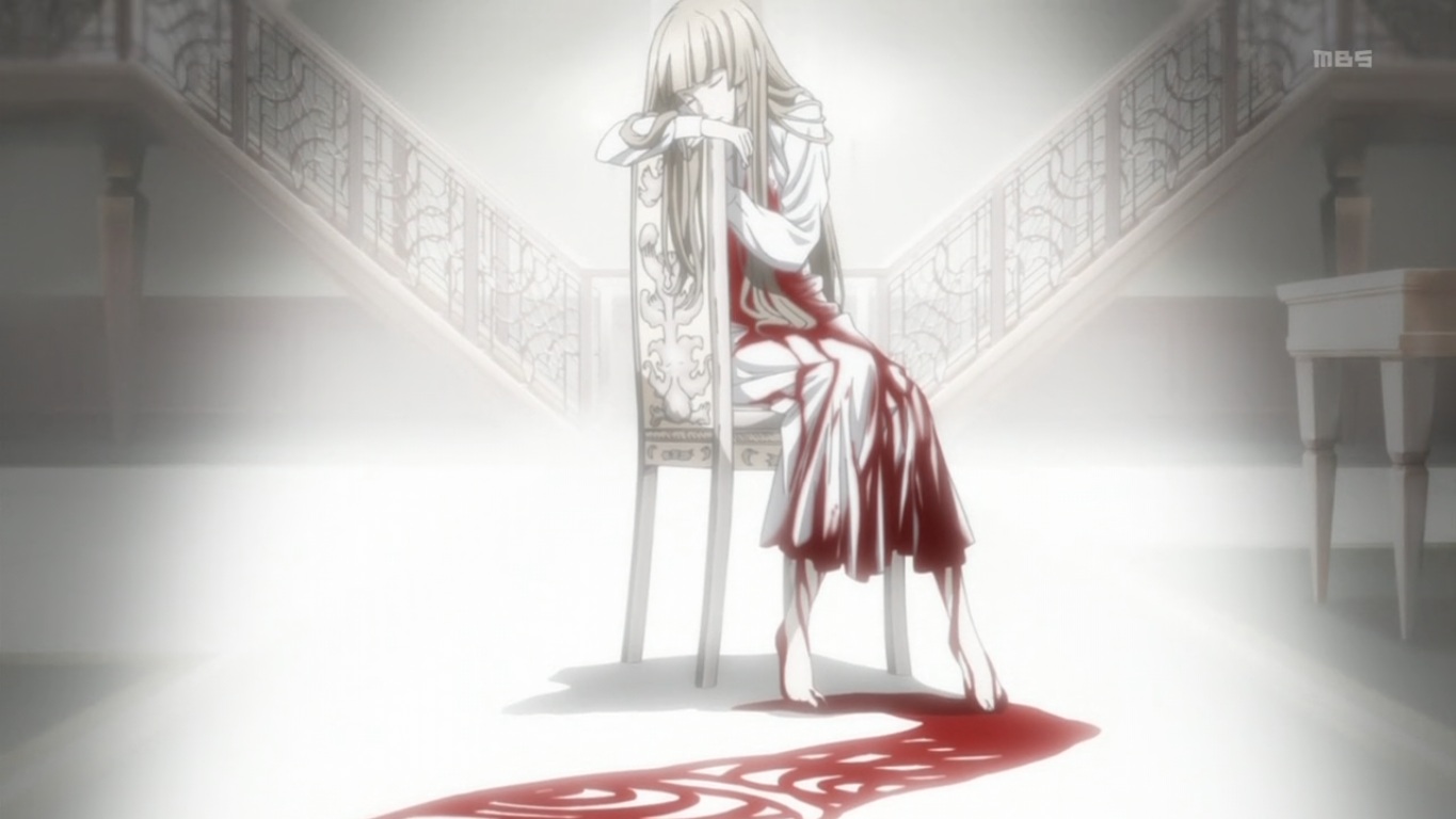 Description: A woman sitting on a chair in a room with stairs and a red stain on the floor and a chair.