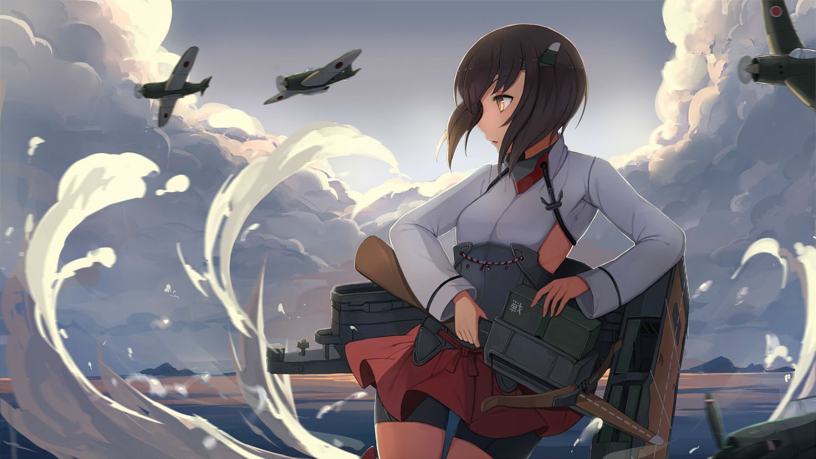 Description: A woman sitting on a chair in front of a sky with planes flying overhead and a man standing behind her.