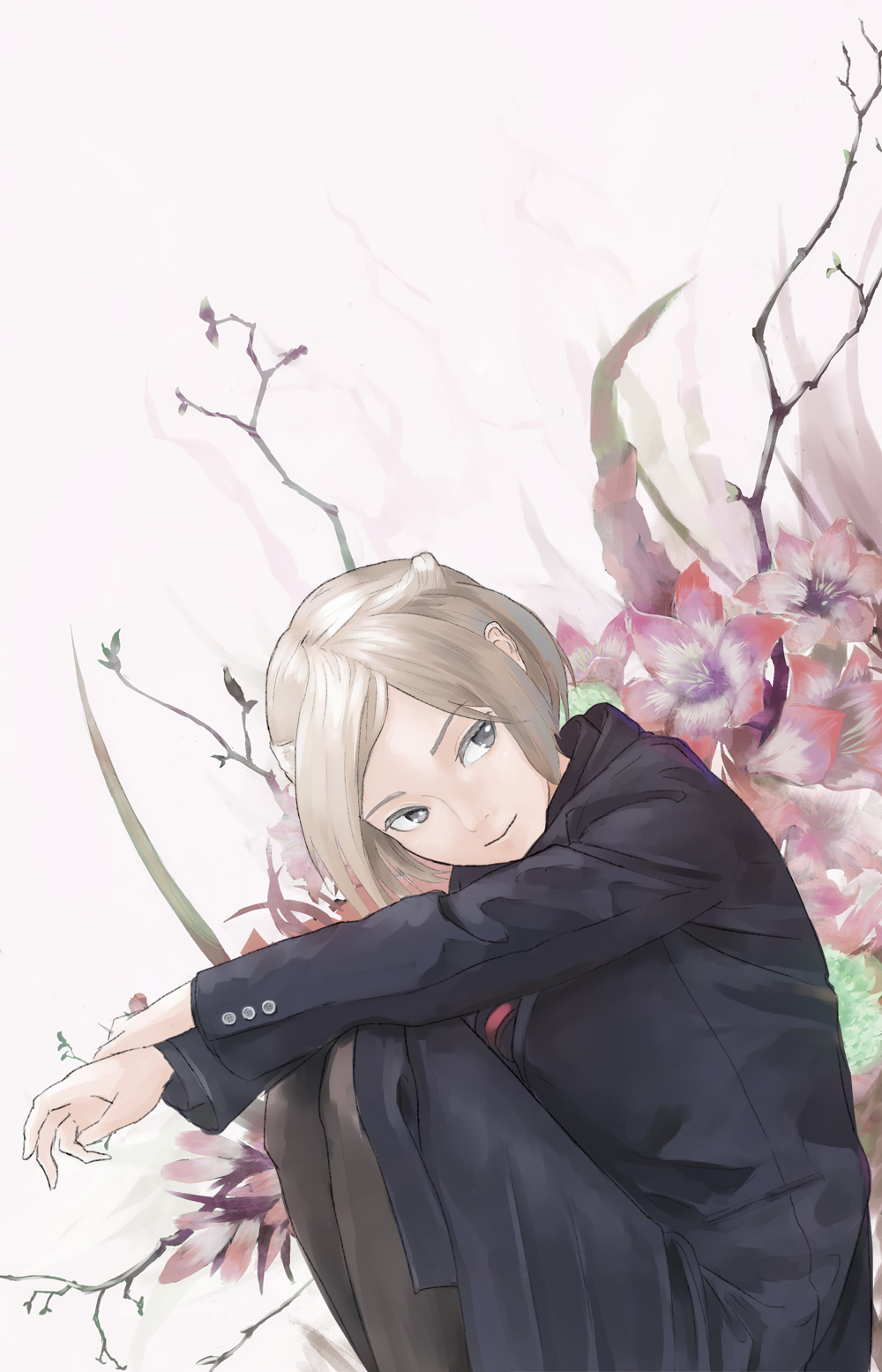 Description: A woman sitting on a chair next to a tree with flowers in it and a white background with a pink flower.