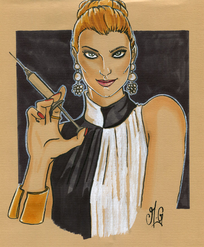 Description: A drawing of a woman holding a cigarette and a cigarette lighter in her hand with a cigarette in her other hand.