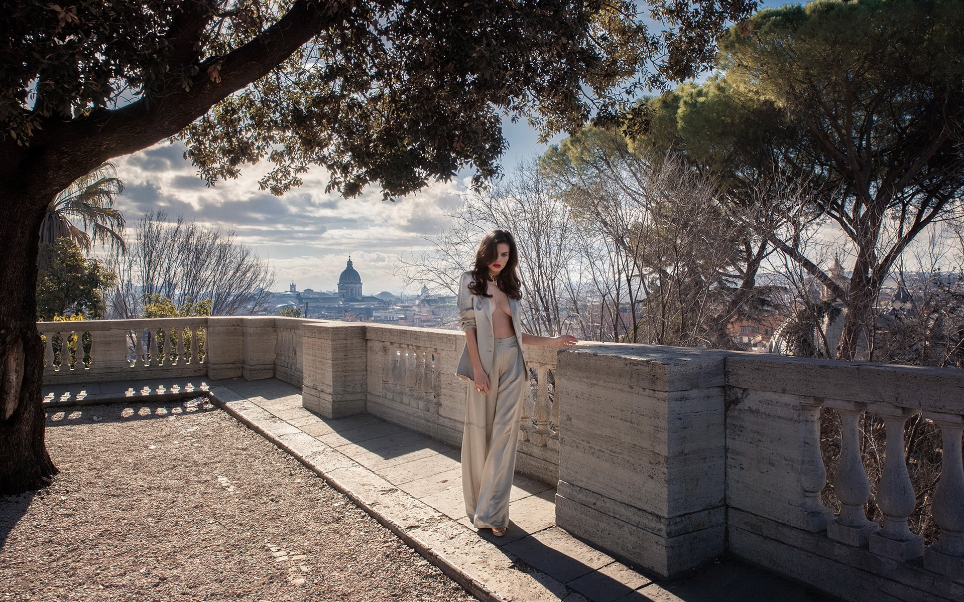 Description: A woman standing on a stone wall next to a tree and a fence with a view of a city.