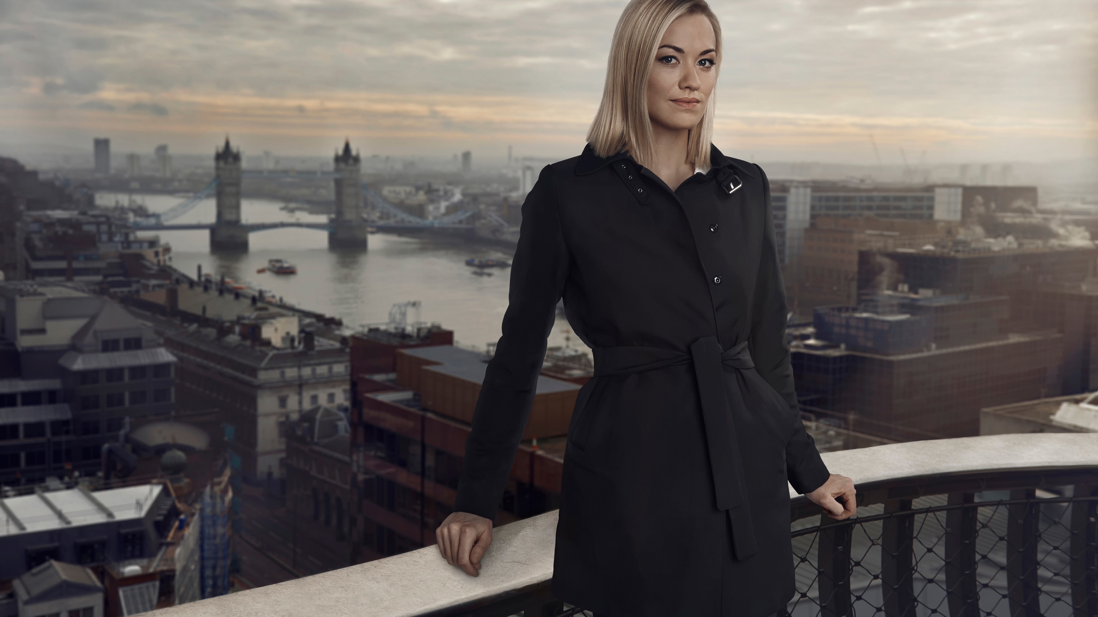 Description: A woman standing on a balcony overlooking a city skyline with a clock tower in the background and a river running through the city.