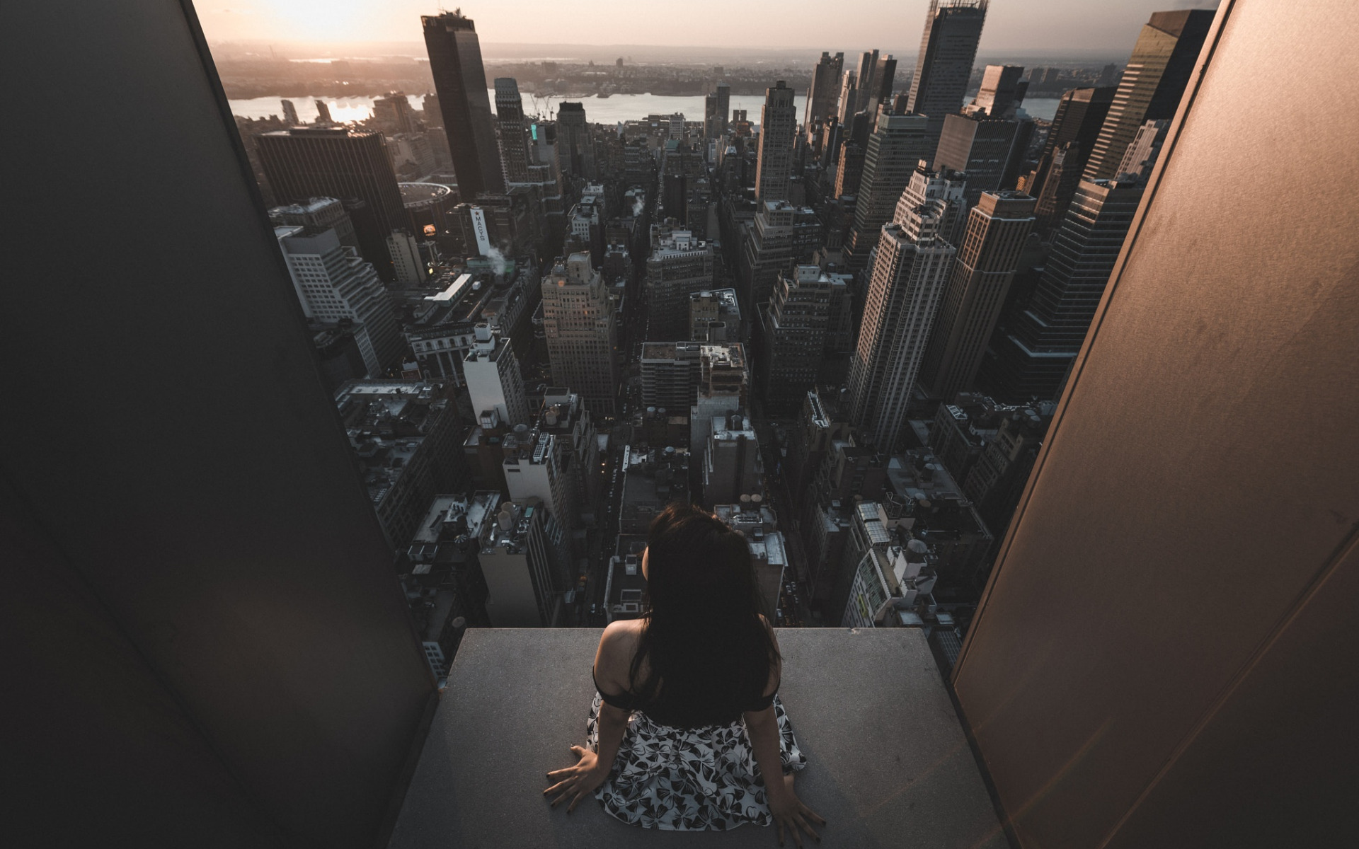 Description: A woman sitting on a ledge looking down at a cityscape at sunset or dawn with a view of the city.