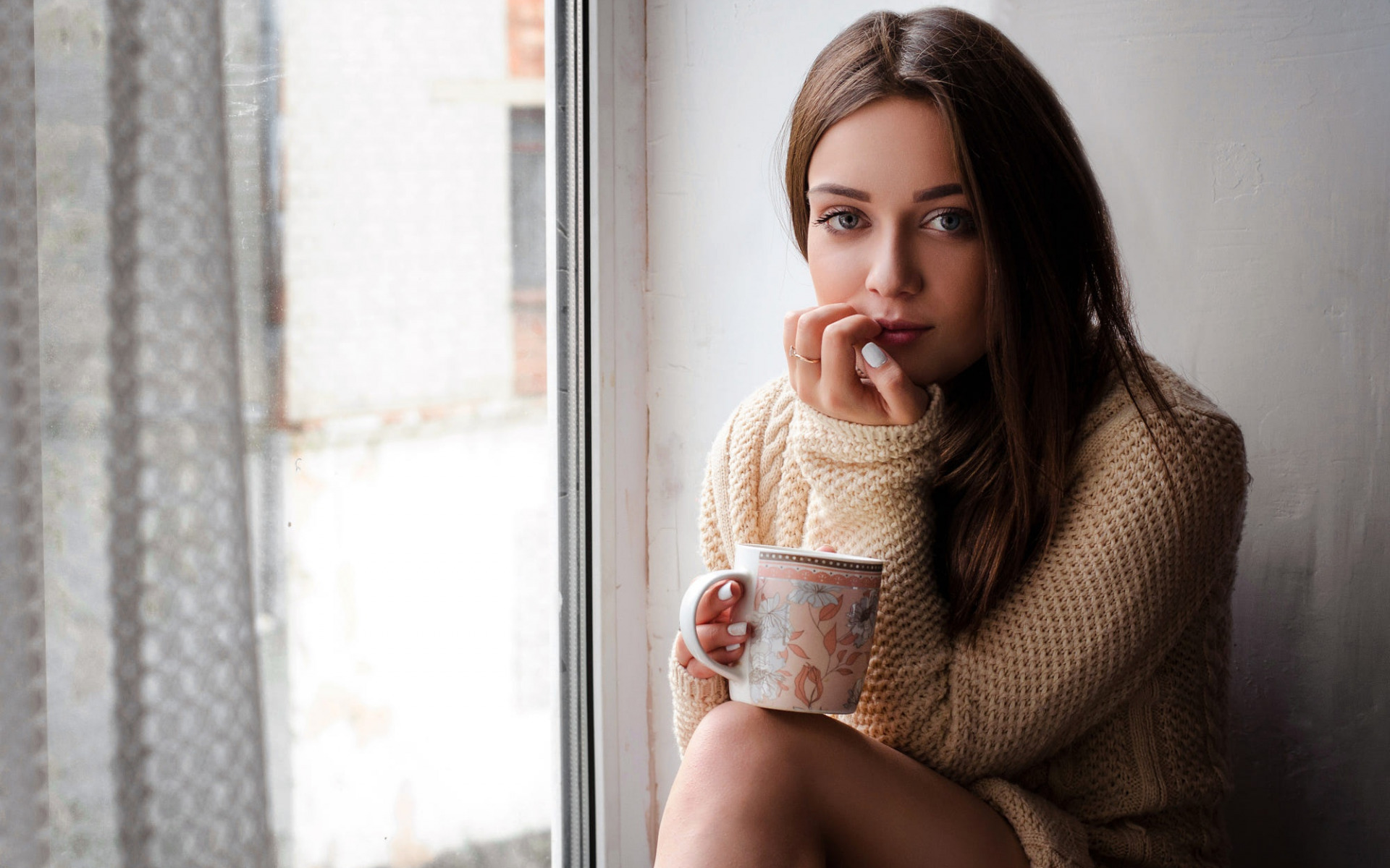 Description: A woman sitting on a window sill holding a cup of coffee and looking at the camera with a thoughtful look on her face.