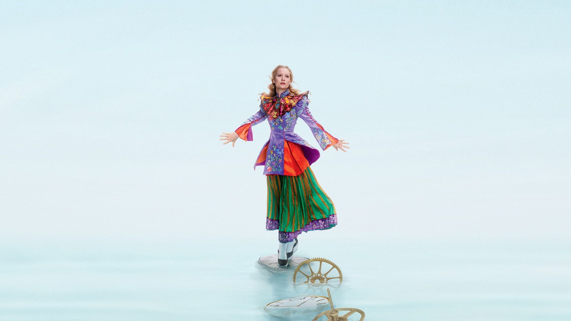 Description: A woman in a colorful dress is balancing on a small wheel on a white surface with a blue background.