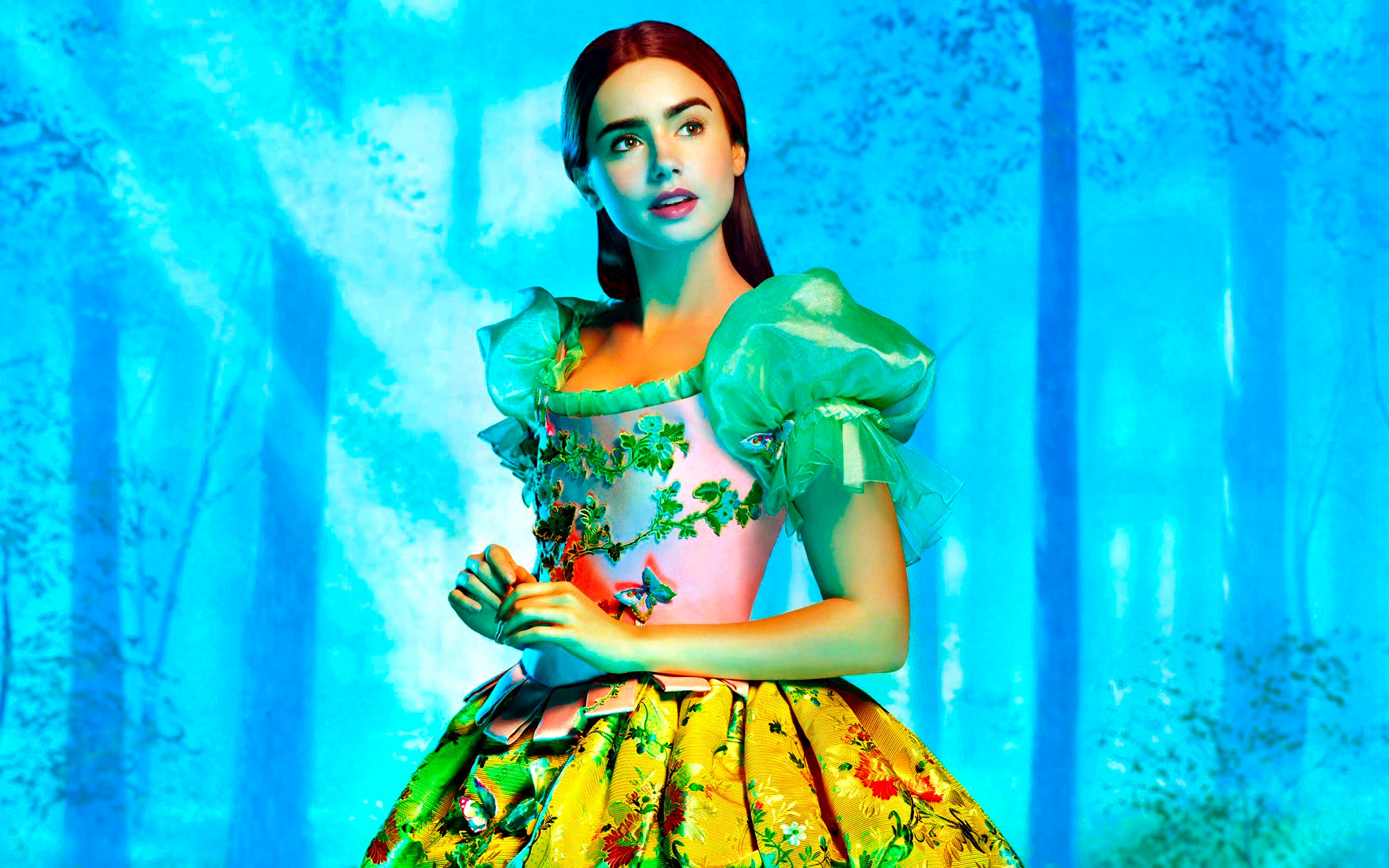 Description: A woman in a colorful dress standing in front of a blue background with trees and flowers on it.