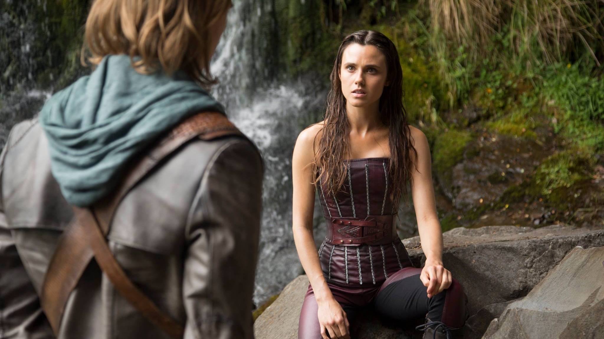 Description: A woman in a corset sitting on a rock next to a man in a suit of armor.