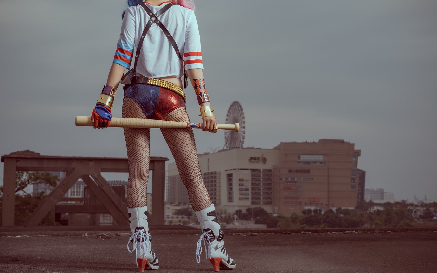 Description: A woman in a costume holding a baseball bat and wearing a baseball uniform and holding a baseball bat in her hands.