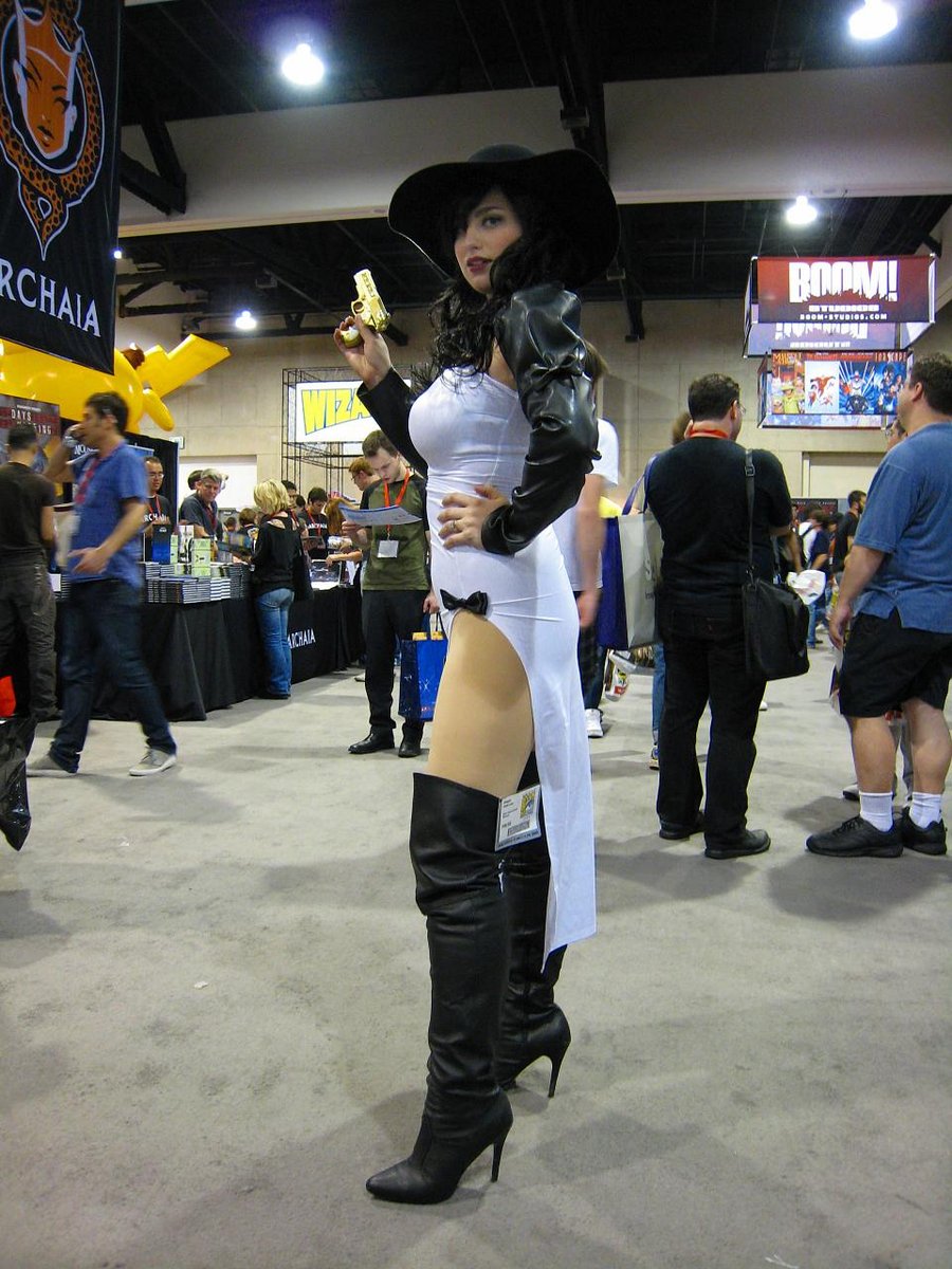 Description: A woman dressed in a costume and boots at a convention or show with a crowd of people around her.