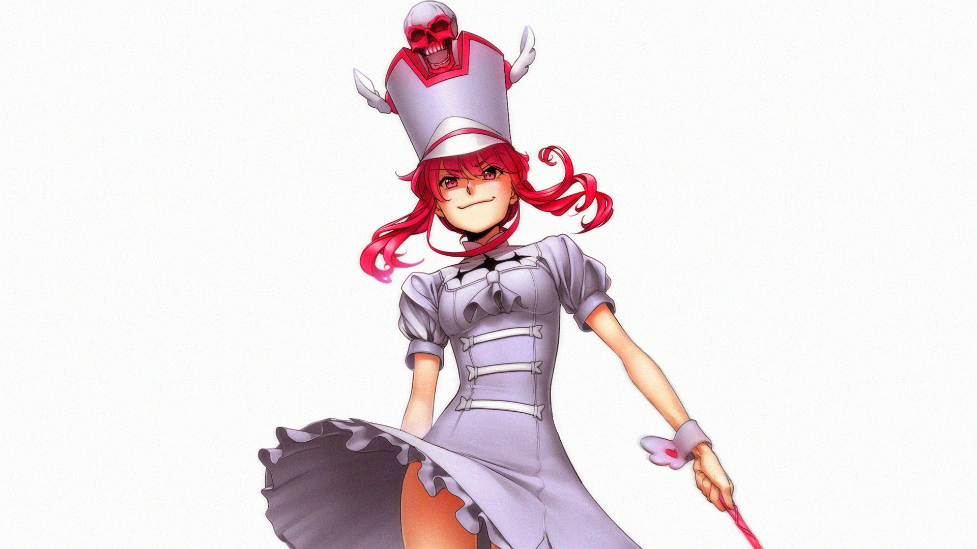 Description: A woman dressed in a costume and holding a cane in her hand and a hat on her head and a dress with a bow.