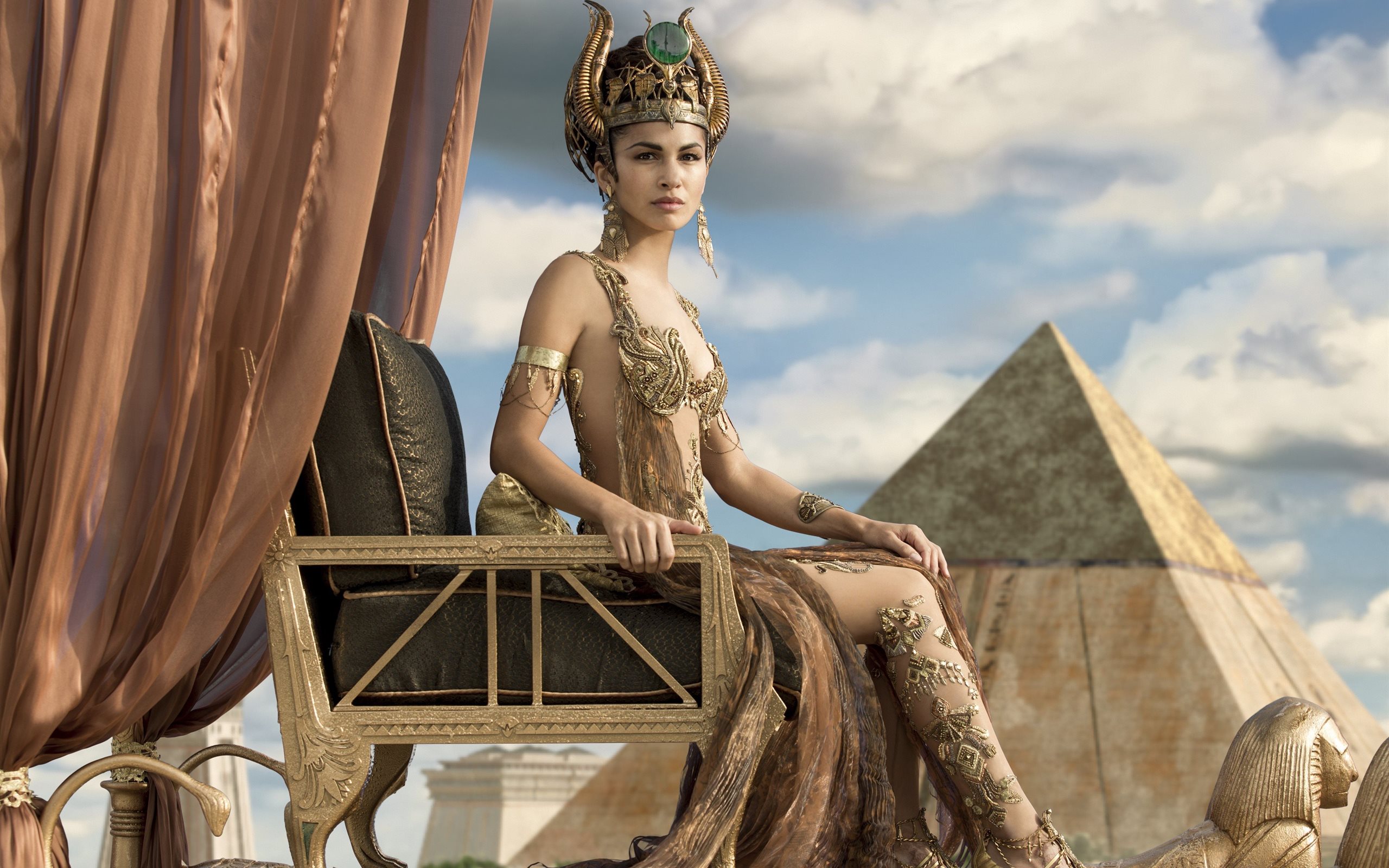 Description: A woman in a costume sitting on a chair in front of a pyramid and a sky background with clouds.