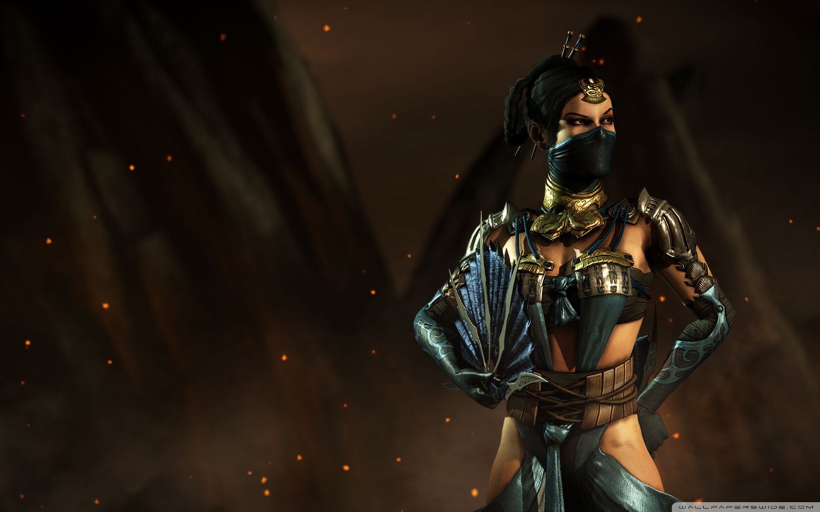 Description: A woman in a costume standing in a dark room with a black background and a black mask on her face.