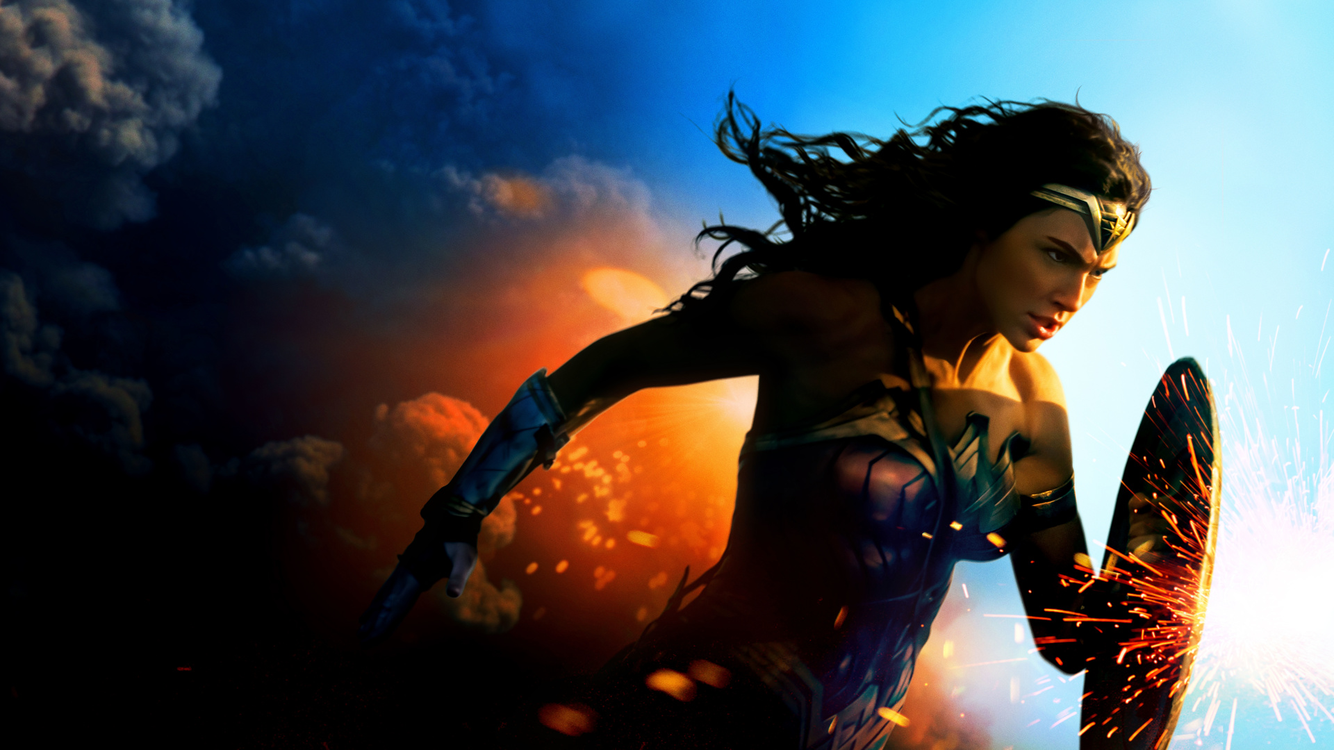 Description: A woman in a costume holding a firework disk in front of a blue sky with clouds and sun.