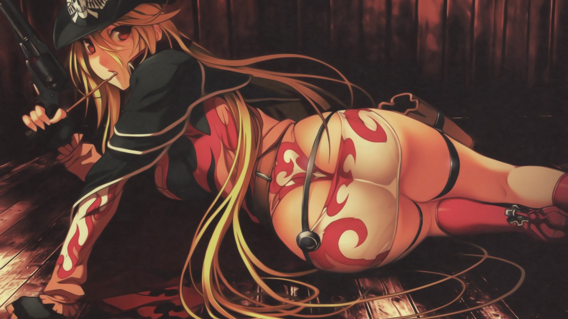 Description: A woman in a costume laying on the floor with a gun in her hand and a hat on her head.