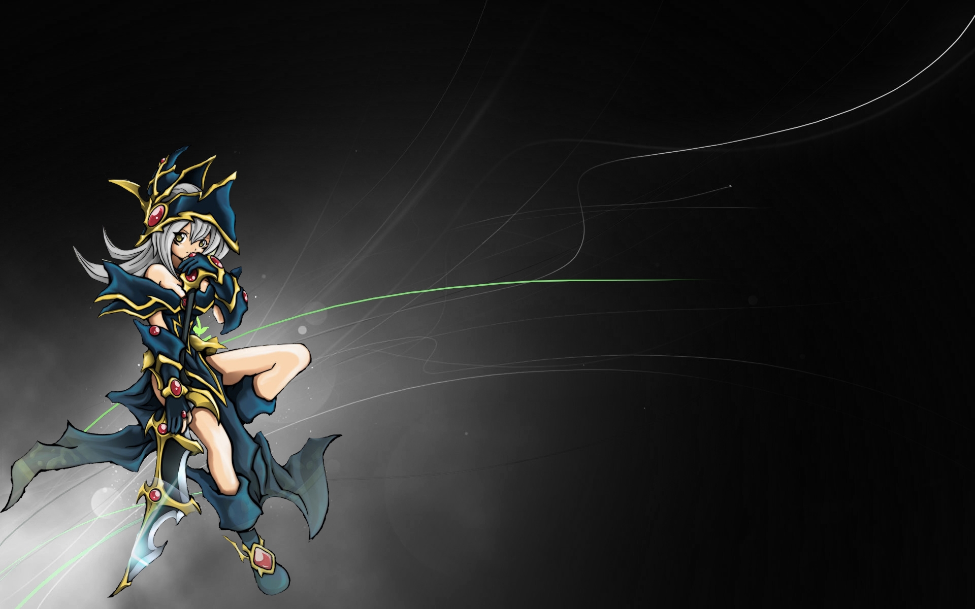 Description: A woman in a costume flying through the air with a sword in her hand and a black background with white lines.